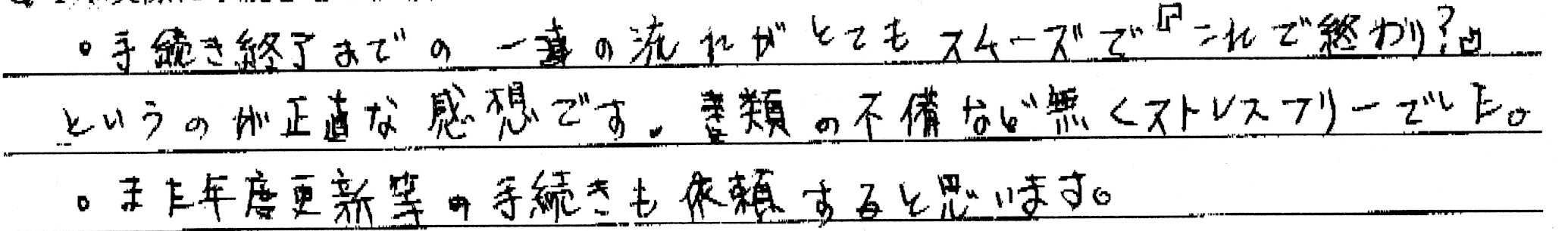 必要書類を迅速にご用意いただいたおかげで、滞りなく手続を進めることができました。