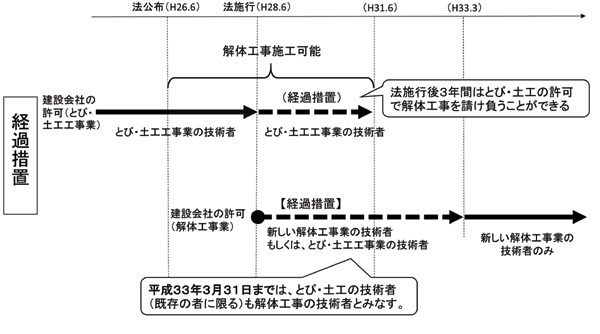 6月の法施行以後約5年間(平成33年3月まで)は、前述の解体工事業許可の技術者の他に、